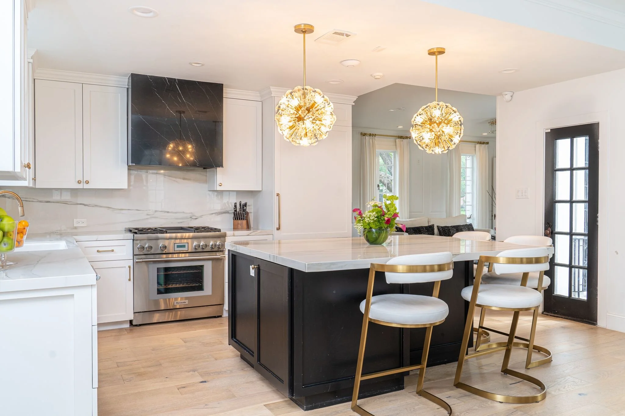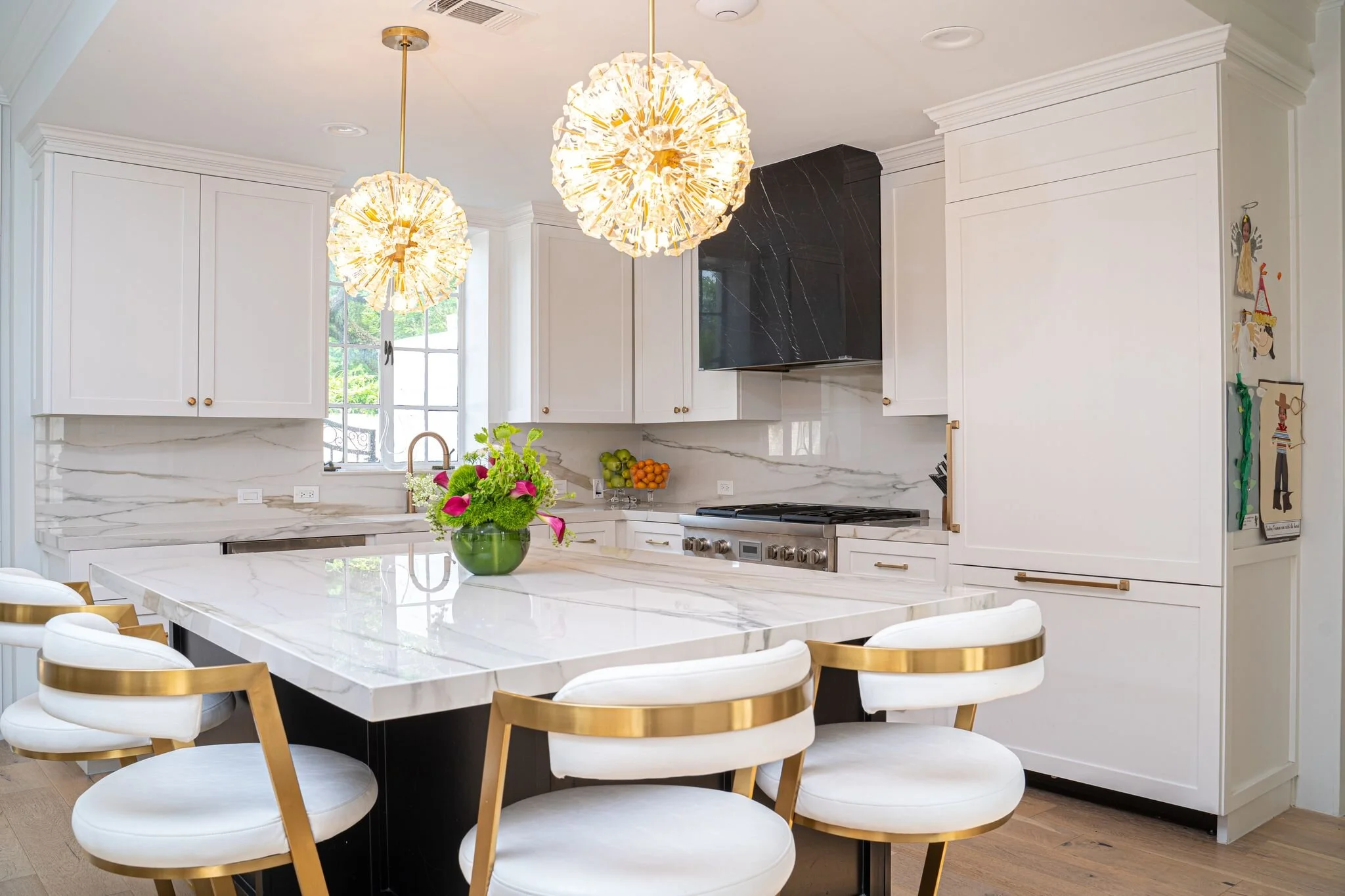 Our team started with custom cabinetry to maximize the space for functional living. With a small space, we knew a light and airy scheme was a must, so white was the way to go. Allowing the fine marble and light fixtures to pop against the clean canvas really adds a flare that our fabulous client was looking for. After all, her home is featured on HBO’s reality series, House of Ho!