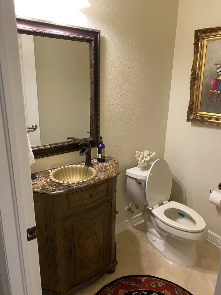 The spacious kitchen features Calacatta Caldia Extra - Premium countertops and touches of gold, while the dining room features a chandelier that once graced Ulysses S. Grant's Potomac home. We added pops of color throughout the home with fine art, accessories and a hand-painted design in the powder room.